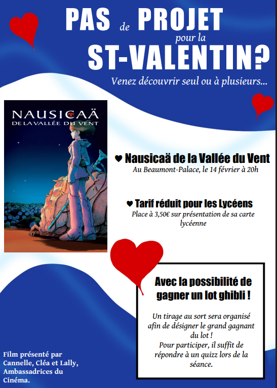 Samedi 14 février à 20h Cannelle, Cléa et Lally (Ambassadrices du cinéma) présentent la projection de Nausicaa de la Vallée du vent (1984) de Hayao Miyazaki et Isao Takahata au cinéma Le Palace de Beaumont. Bande-annonce de Nausicaa : (...)